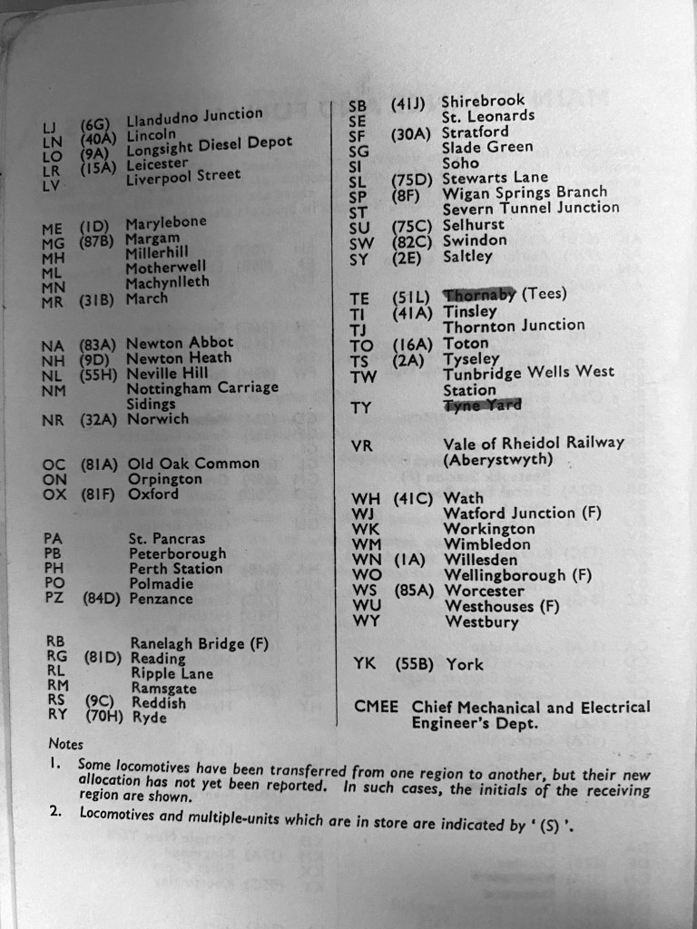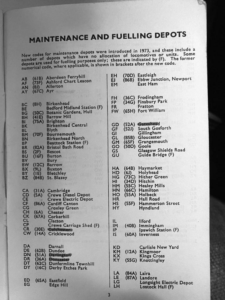 It was also the first full year of the new two letter depot codes, which replaced the old steam era shed codes, and I have added those to the sightings from the 1974 Locoshed book. Photos of the depot pages from the book can be found at the bottom of this page.
