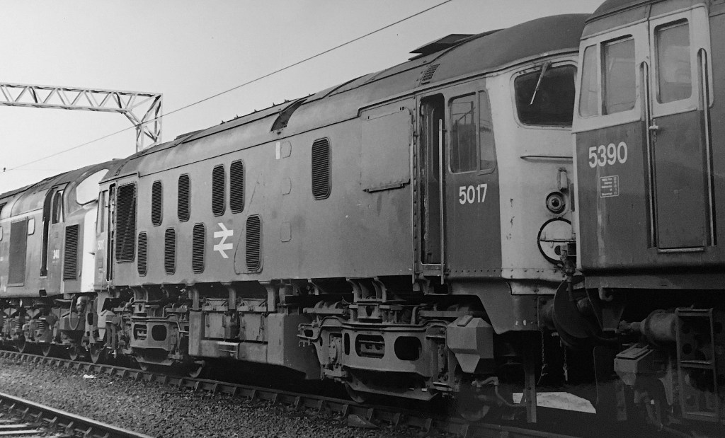 At Kingmoor depot in September 1973, class 24 5017 is seen sandwiched between class 40 340, and class 27 5390.