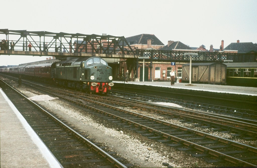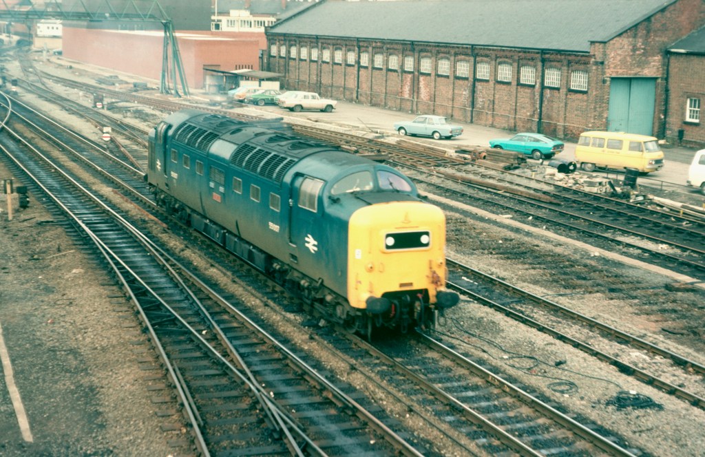 Deltic 55007 ‘Pinza’ moves away from the station towards Doncaster loco in November 1979. Like many of the pacifics, the Finsbury Park Deltics were also named after racehorses – Pinza being the 1953 Epsom Derby winner.