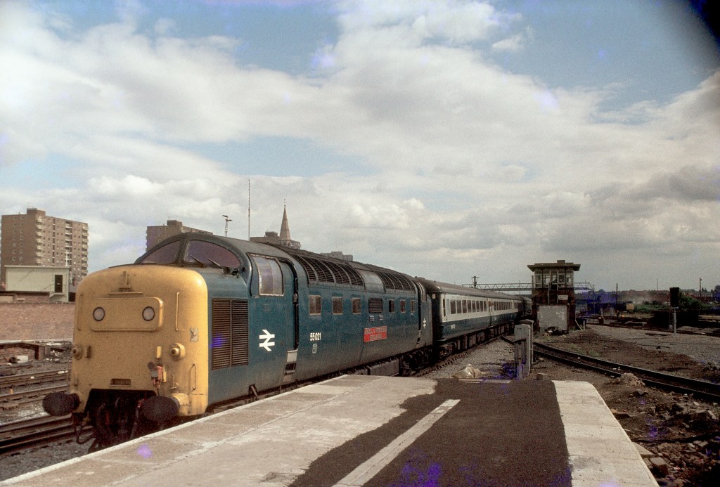 Haymarket based Deltics were adorned with regimental names. On a sunny spring day in 1979, 55021 ‘Argyll & Sutherland Highlander arrives with Mk2 coaches.