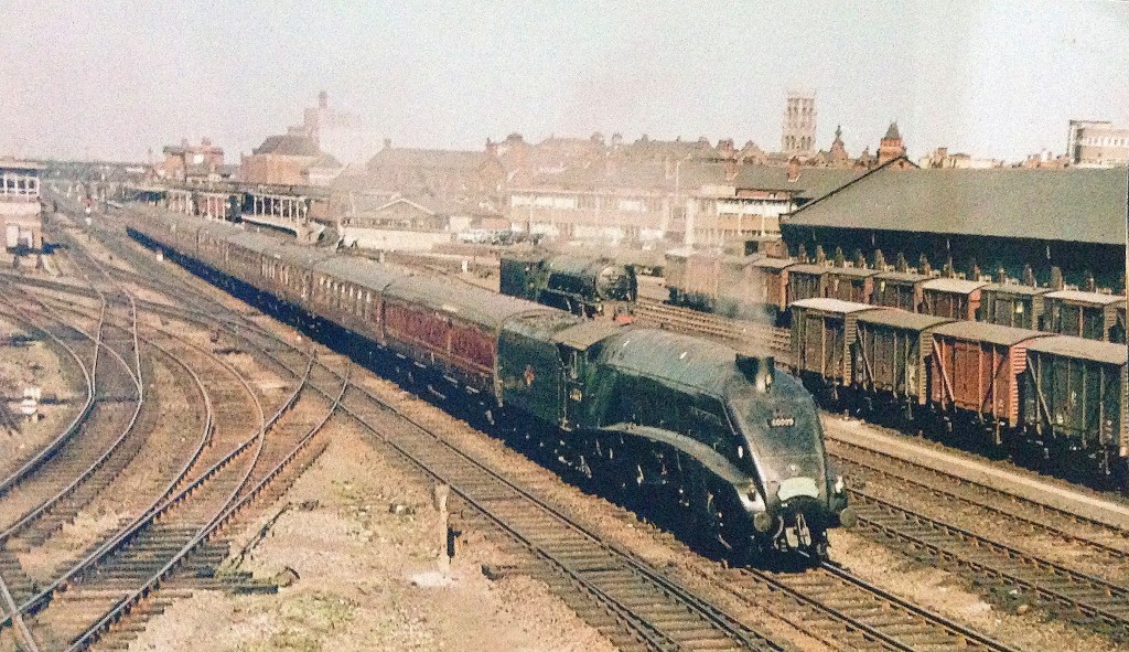 A rather grainy image of A4 60005 ‘Sir Charles Newton’ paasing non-stop through Doncaster station with an express for Kings Cross in 1961. An A1 is the up standby locomotive in the background.
