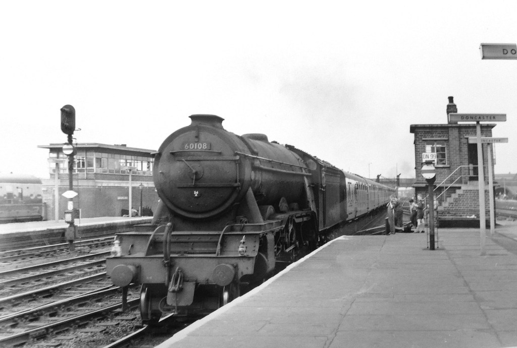 A3 60108 ‘Gay Crusader’ arrives at Doncaster with a passenger service during 1960. Like so many ex-LNER pacifics, 60108 was named after a racehorse. Gay Crusader won the 2000 Guineas, Derby and the (alternative wartime) St Leger in 1917.