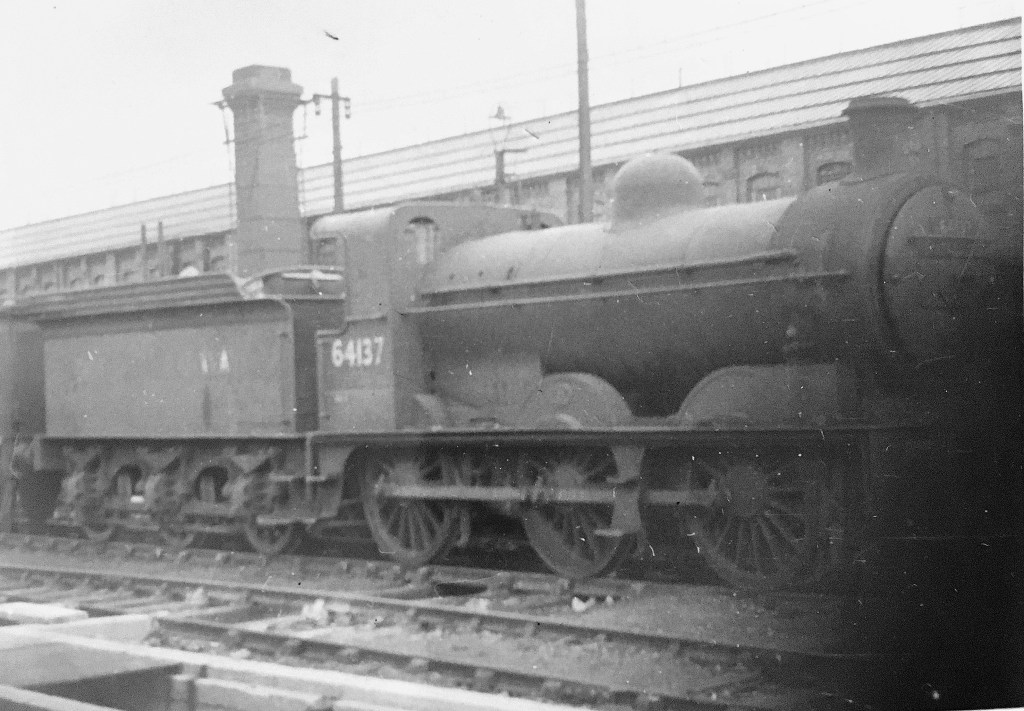 Thumbs can be a menace when they encroach towards the camera lens. If the date for this photo (1951) is correct, it is most likely that J3 64137 has been withdrawn from Boston shed; and is most likely awaiting its final trip to The Plant. The ‘L’ and ‘A’ of the BR lettering are all that can be seen on the tender.