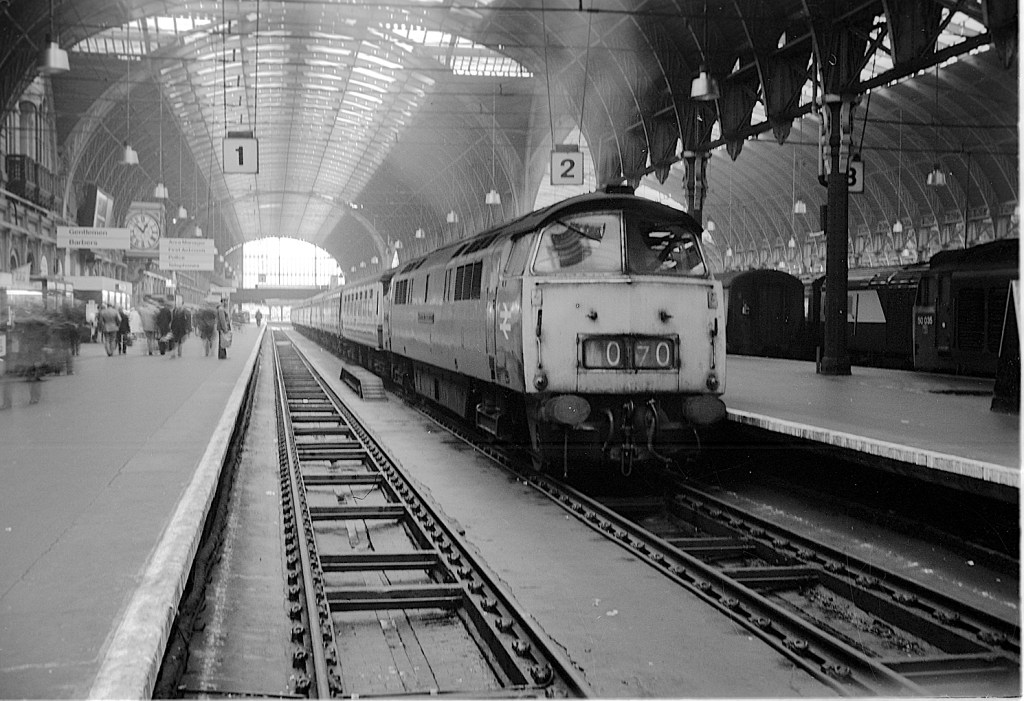 D1070 ‘Western Gauntlet’ is at Paddington in October 1976. With higher power output, these locomotives were used on the majority of expresses until usurped by the class 50s and HSTs – examples of which can be seen on the right.