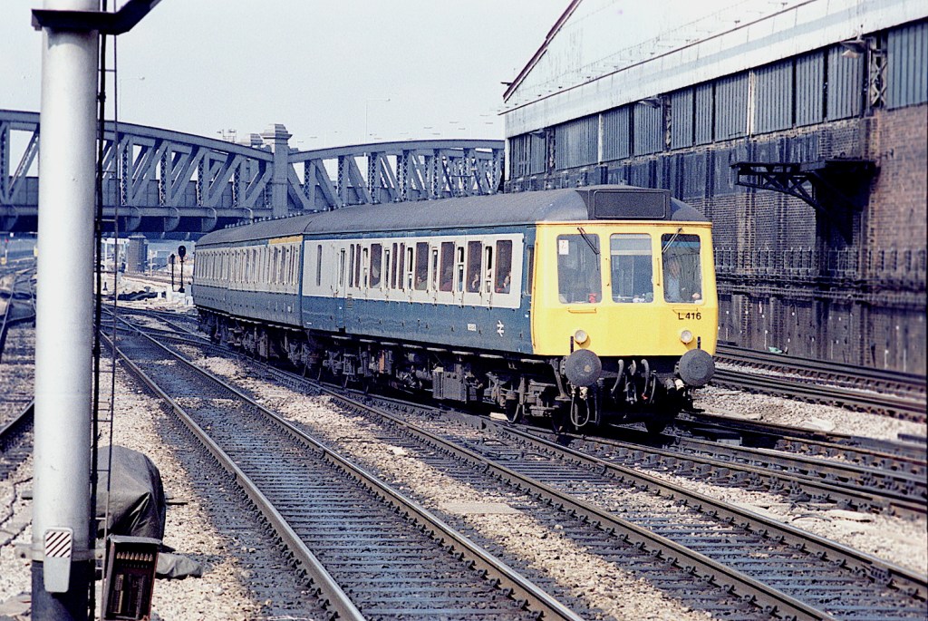 BR had dedicated 3-car DMUs for suburban work, built by Pressed Steel Ltd and classed 117 under TOPS. Here L416 arrives at Paddington with a service from the Thames Valley in 1988. The units tended to remain in sets, and L416 was W51353, W59505, W51395.
