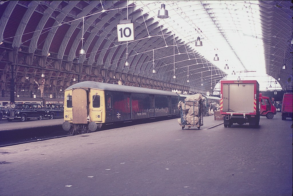 Paddington in 1977 and parcels unit 55991 is seen at platform 10 while Royal Mail staff load mailbags onto the train. There were half a dozen of these particular single units with gangway connectors, class 128.