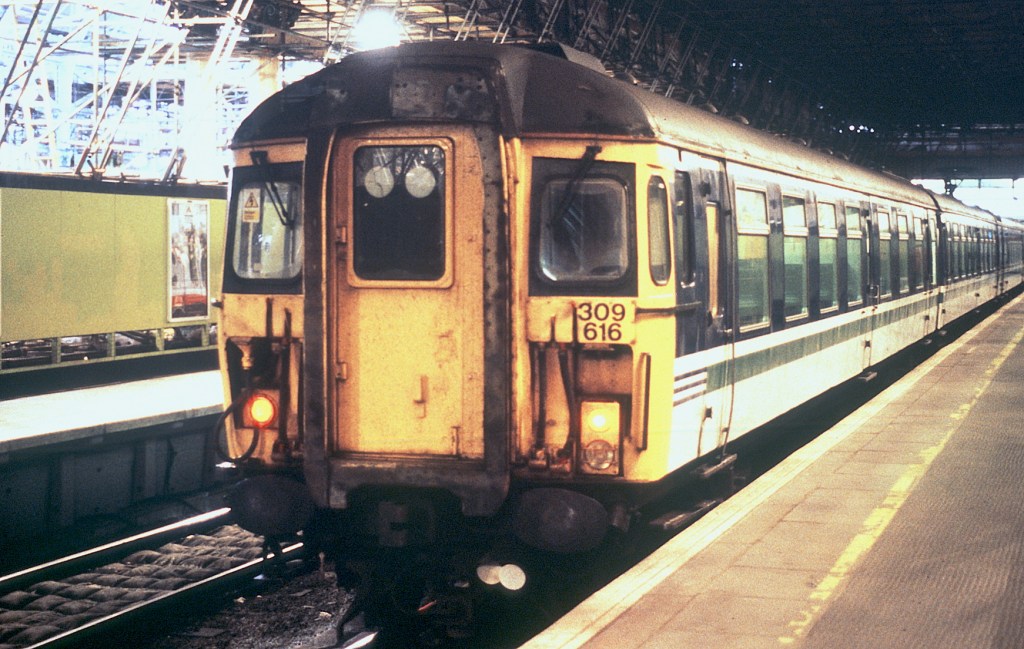 During the 1990s, class 309 EMUs displaced from the Liverpool Street to Clacton services, were used between Piccadilly, Stoke On Trent, and Crewe. Here is 309616 at Piccadilly station on February 6th 1999.