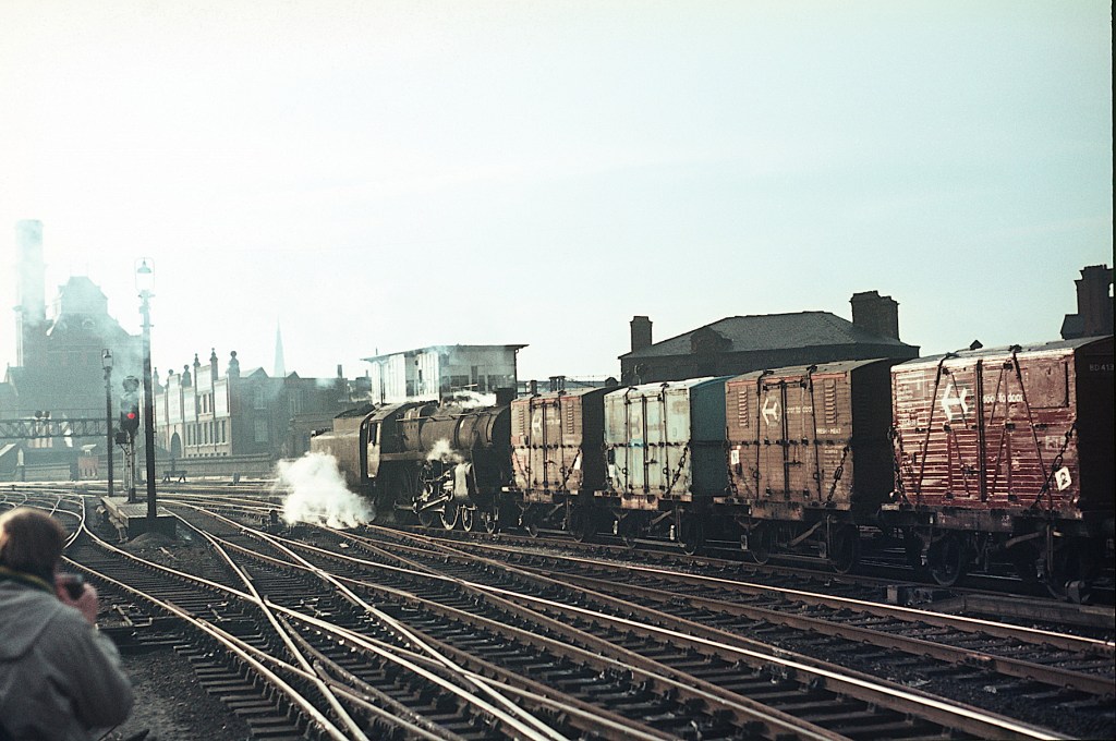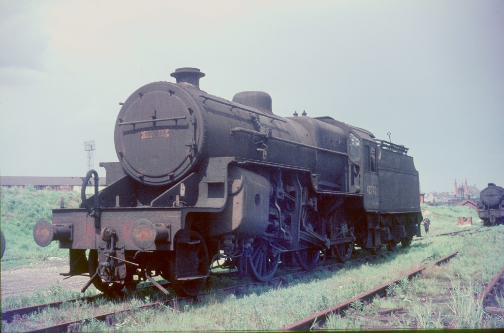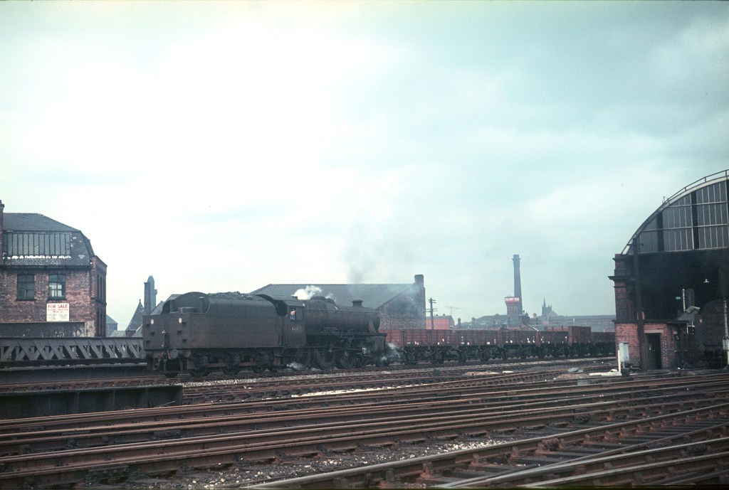Stockport Edgeley shed was situated just to the south of Stockport station (yes I know Stockport and Manchester are two separate cities, but not for the purposes of this page) and the shed was adjacent to Stockport County’s football ground; part of which can be seen to the left of the engine. Fowler ‘Crab’ 2-6-0 42772 has been withdrawn for almost a year in this Spring 1966 photo.
