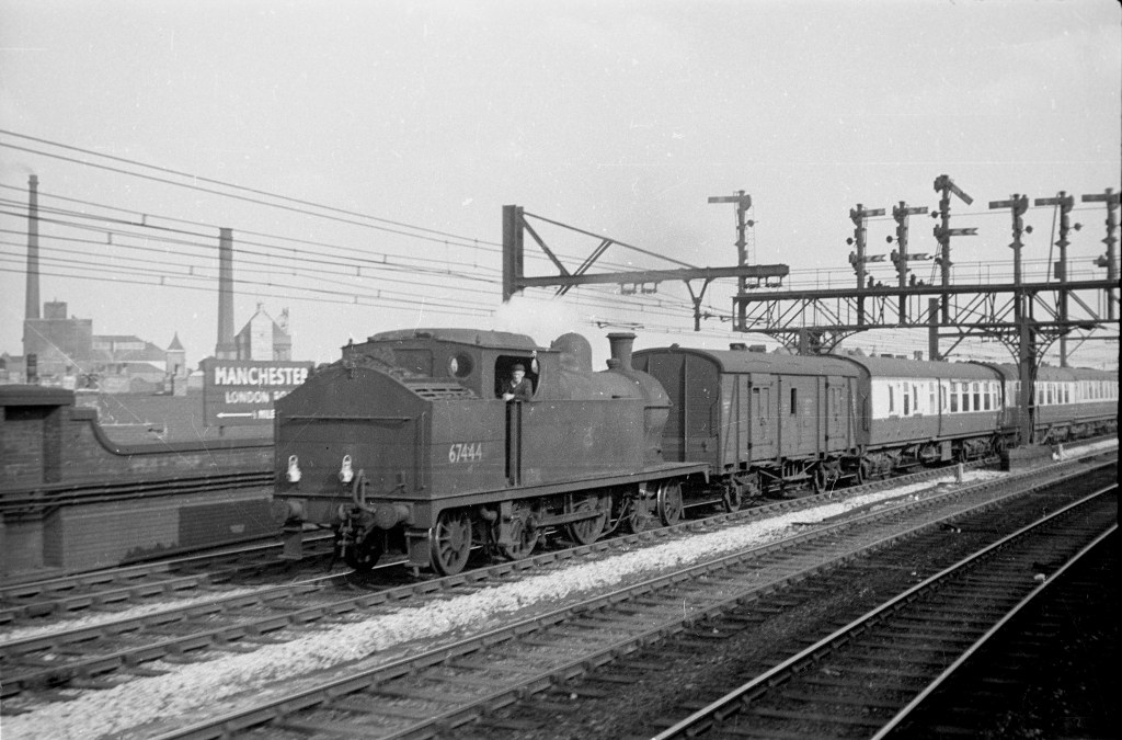In pre-electrification days, Piccadilly was named Manchester London Road, as can be seen here in this September 3rd 1955 view. Two tracks were wired for the 1500v DC Woodhead route trains to Sheffield. Robinson 4-4-2T of Gorton shed brings in empty stock, which may be for the Harwich Boat Train as carriages do seem to have headboards. The locomotive was withdrawn two years later.