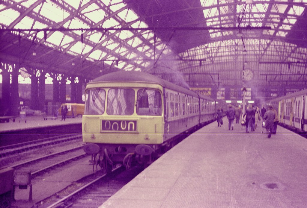 A poor quality photograph taken on budget film with poor colour rendition, but it does show a Swindon built Trans-Pennine DMU (by that time class 124) at Piccadilly station in 1978. The class 108 unit on the right is painted in the ‘refurbished’ livery of white with a blue stripe.