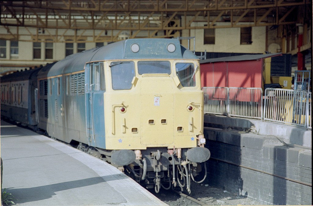 In the occasional chaos, of repair work, that was Manchester Victoria; an unidentified class 31 is seen with a parcels service in 1989.