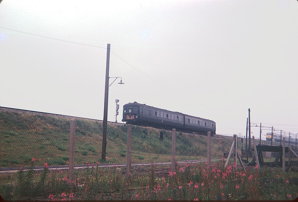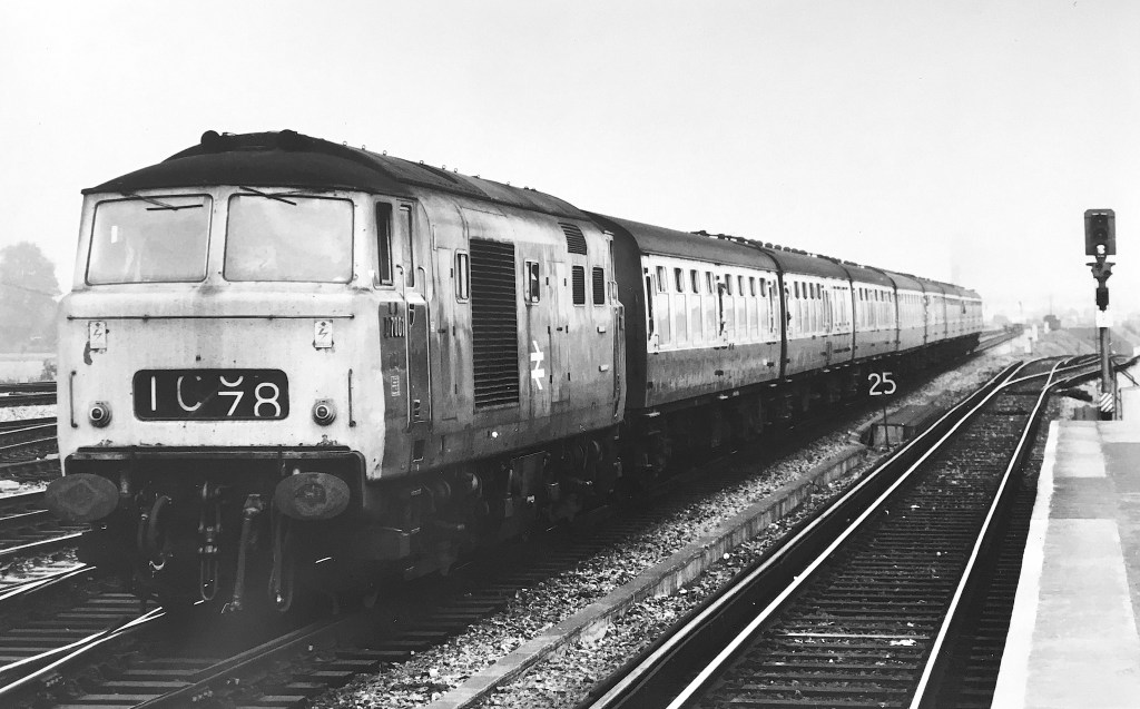 Southern Region DEMUs worked a number of passenger services to/from Reading. 1204 is most likely on a Gatwick Airport or Redhill working in this winter 1975 view. These units were nicknamed ‘Tadpoles’ because they were a cheap lash-up using surplus narrow Hastings gauge carriages, and a 2EPB driving trailer which was built to the wider standard loading gauge.