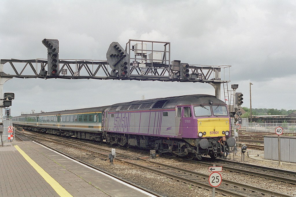 Early 21st century Reading and 57601 heads a train of First Great Western passenger stock into the station during the summer of 2001. This is either an extra working of some form, or the booked HST set has failed.
