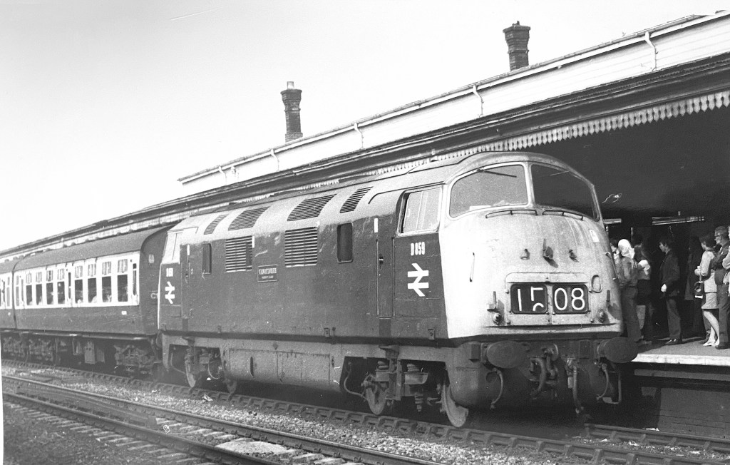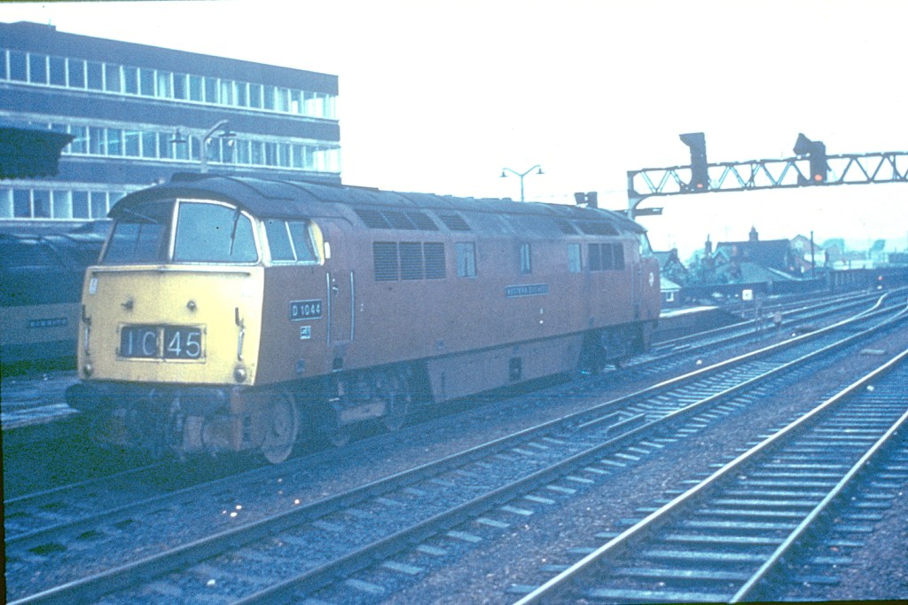 D1044 ‘Western Duchess’ is at Reading in June 1969. Interestingly, in the bay platform normally used by stopping trains to places such as Basingstoke, is class 47 D1670 ‘Mammoth’.