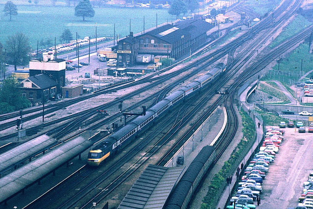 Taken from the office block near to the station, an HST leaves Reading for Paddington in 1977. This is one of the original 2+7 formations, before an extra TS was added, and the TGS were yet to be introduced, so the guard was expected to ride in the power car.