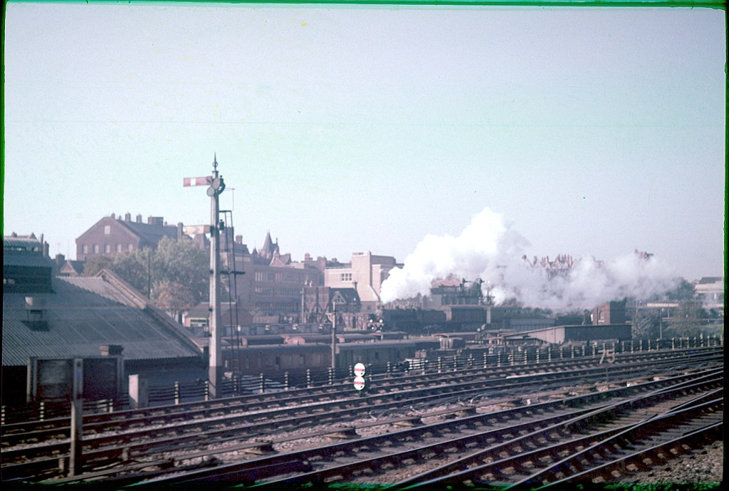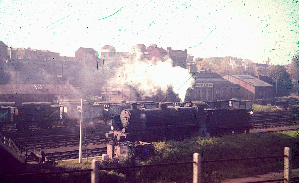 I don’t have many photos of the Southern station and it approaches, but here is one taken from a train on the ex-GWR tracks. Class N 2-6-0 31871 is seen waiting for its next move in 1963. The Huntley & Palmer’s biscuit factory forms the backdrop, and had its own sidings from this railway.