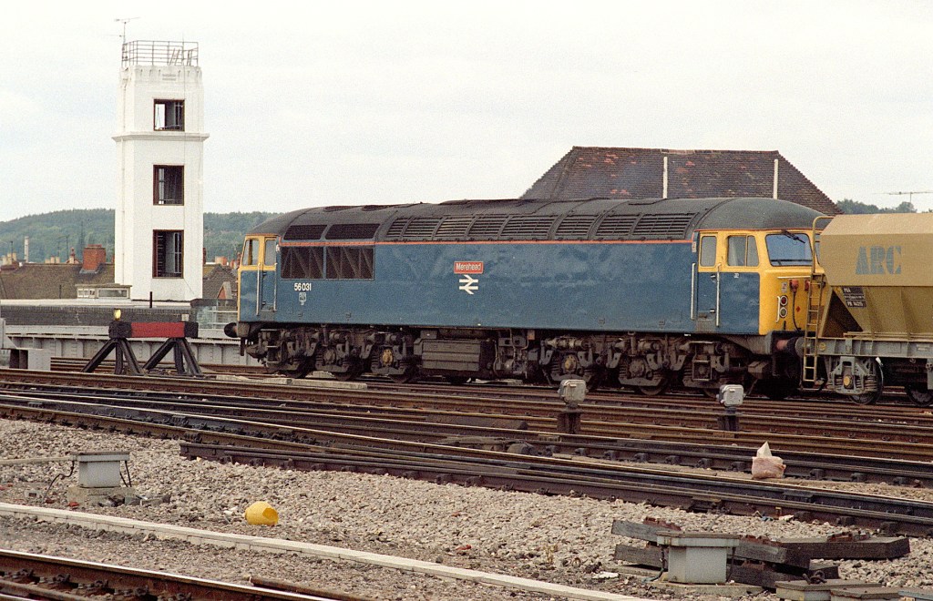 In the immediate years before the class 59s, Mendip stone traffic was handled mainly by class 56s allocated to Bath Road but outbased at Westbury. 56031 ‘Merehead’ is heading west through Reading with ARC 4-wheeled PGA hoppers in the early 1980s.