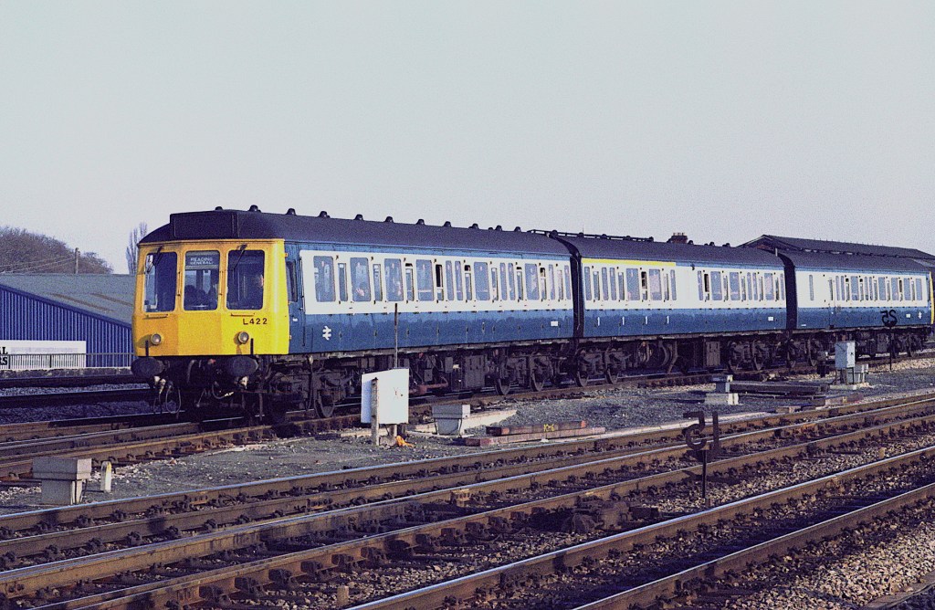 Class 117 DMUs ran most of the stopping services to/from Reading for 30 years or so, until the arrival of the 165/6 units. L422 heads towards the station in the early 1980s. According to my notes, L422 was W51360 W59512 W51402.