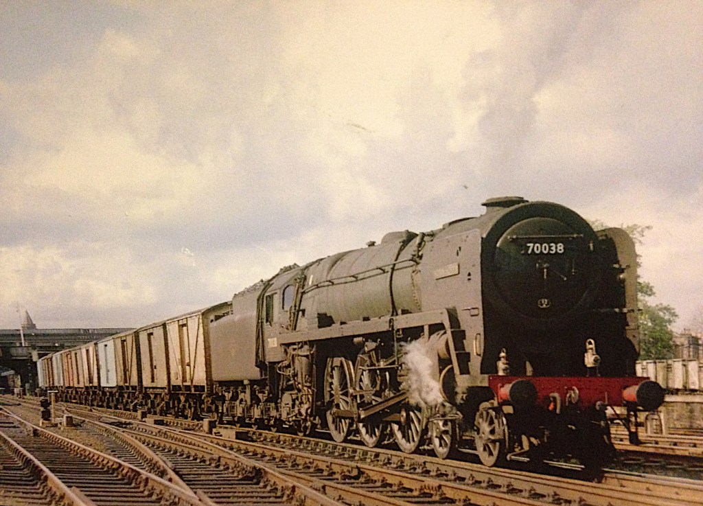 Britannia pacific 70038 ‘Robin Hood’ leaves Perth with a fish train in May 1964. Modellers note that almost every van behind the locomotive is a different shade of their original base colour.