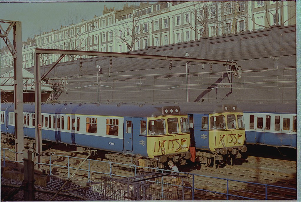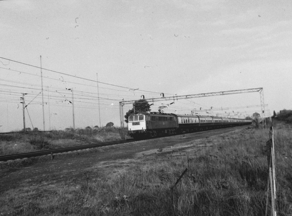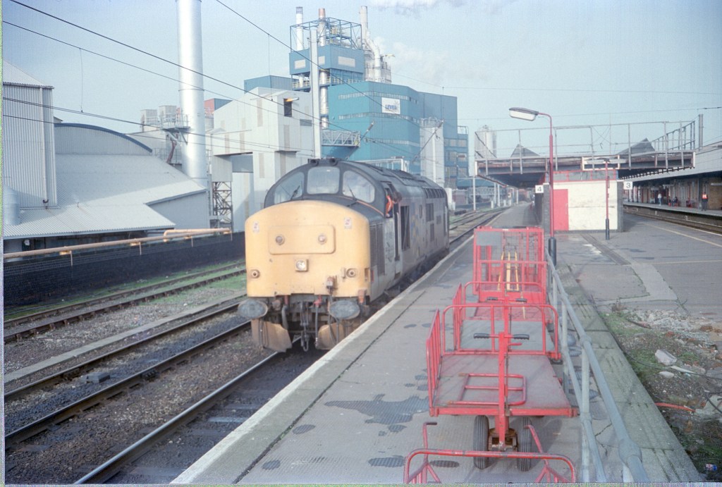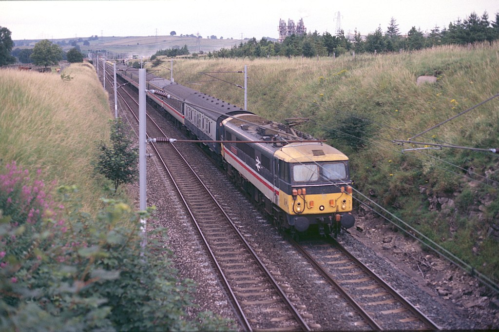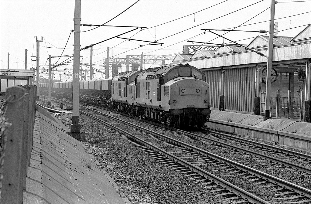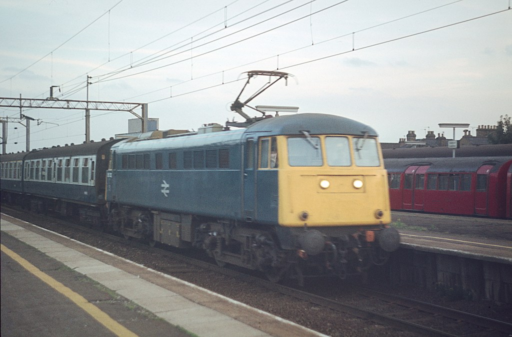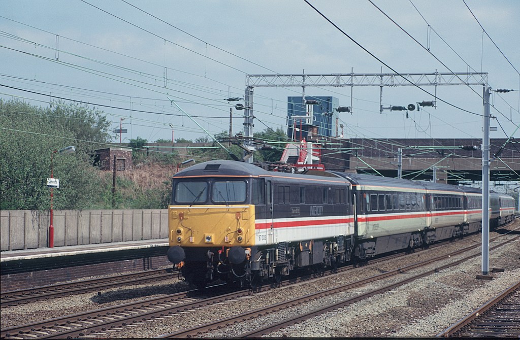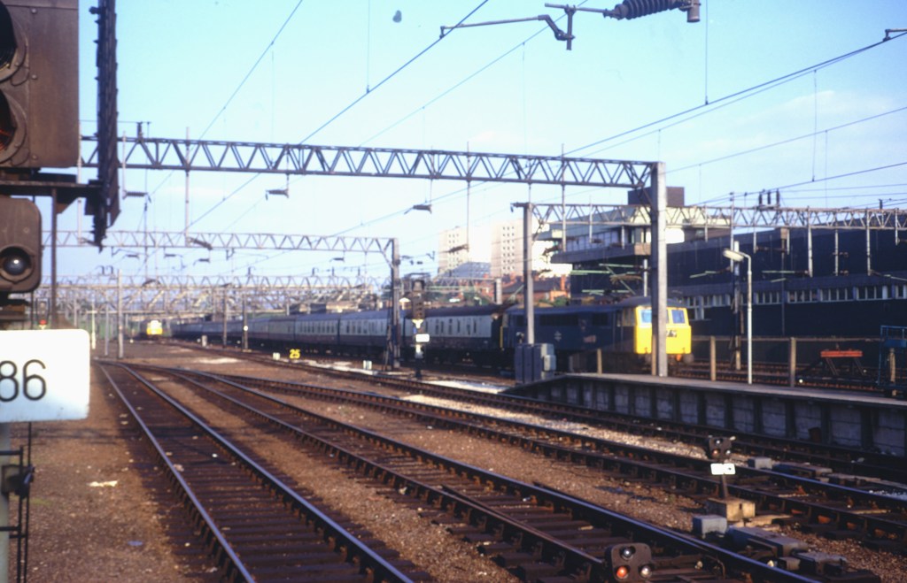 Sadly, I have no notes on this and can’t quite read the number of the 85 passing Nuneaton on March 25th 1985. The train is a mixture of Mk2s and Mk3s with two Mk1 BGs behind the loco, but may be empty stock.