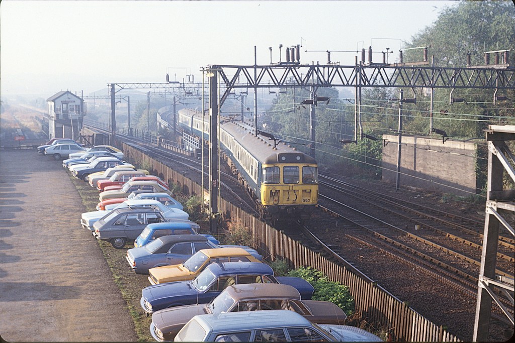 A more identifiable view of Northampton. 310082 is seen with a stopping train from Euston on September 30th 1982. The early 80s line-up in the car park is of interest.