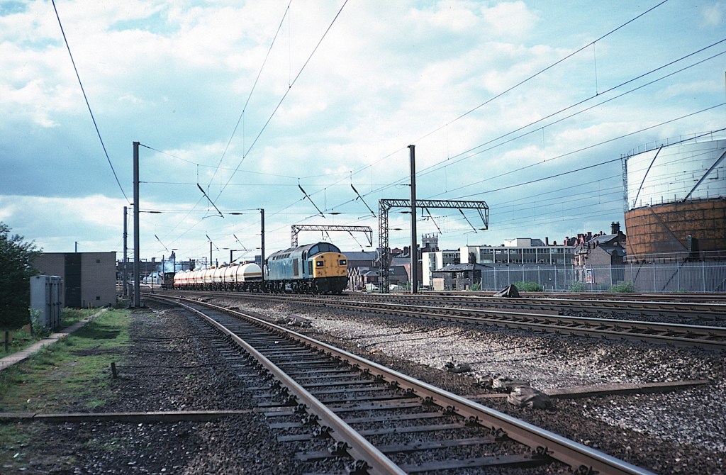Ten years later and another split head code class 40 (or possibly the same one – the number is not recorded) has charge of a train of chemical tanks and is seen passing Wigan on May 29th 1979. Due to the hazardous nature of the chemicals, these trains ran with a guards van, and barrier wagons at both ends.