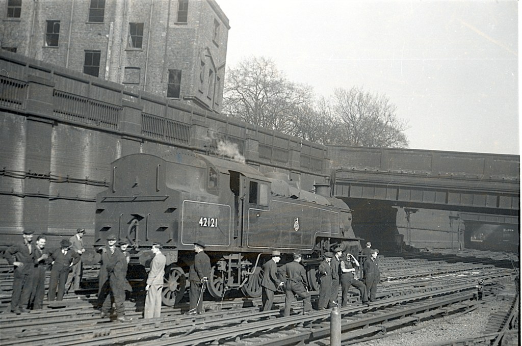 On May 4th 1950 Fowler 2-6-4t 42121 became derailed just outside the station. Here we see the numerous staff needed to scratch their heads and decide what to do next.