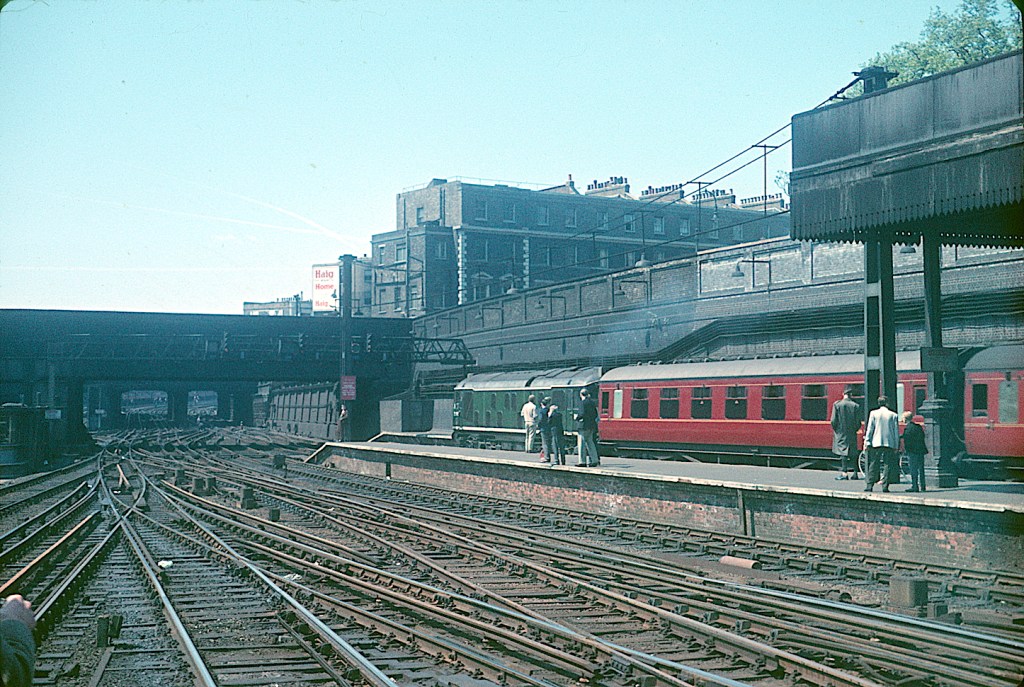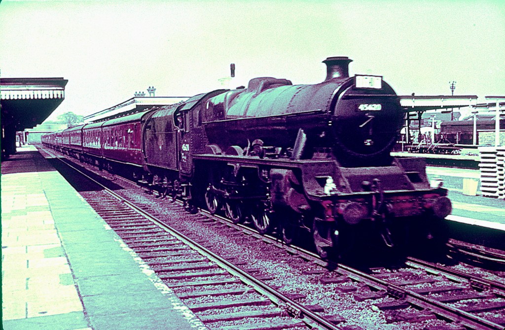 This is Watford Junction in the early 1960s, with 45620 ‘North Borneo’ passing with a southbound express on April 27th 1963. Unfortunately the colour balance of the film used was not particularly good – resulting in this red/green hue. I have corrected it a little, but my skills are limited.