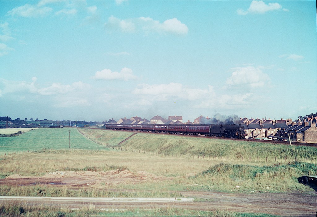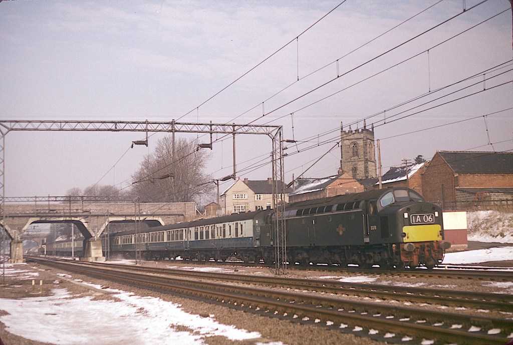 Between Rugby and Nuneaton, the WCML passes through the village of Shilton, which used to have a station. Passing the site of the station on March 5th 1965 is D370 with 1A06 which I assume is an Anglo-Scottish express (although I don’t have any working timetables). Of interest is the XP64 coaching stock in the train. These coaches can be identified by the recessed doors and more of a Mk2 body profile.