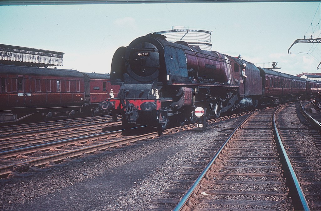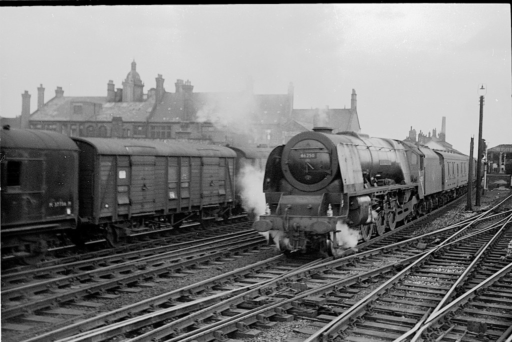 It is all maroon here as 46238 ‘City Of Carlisle’ approaches Lancaster station in 1962. The electrification supports for the Lancaster – Morecambe – Heysham route can be seen on the extreme right.