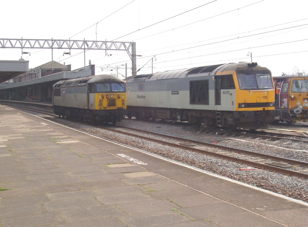 A slightly more recent photo from Nuneaton. However, although this may seem like a mid-1990s image, it was actually taken on April 15th 2003. 56099 on the mainline runs past 60073 in the siding.