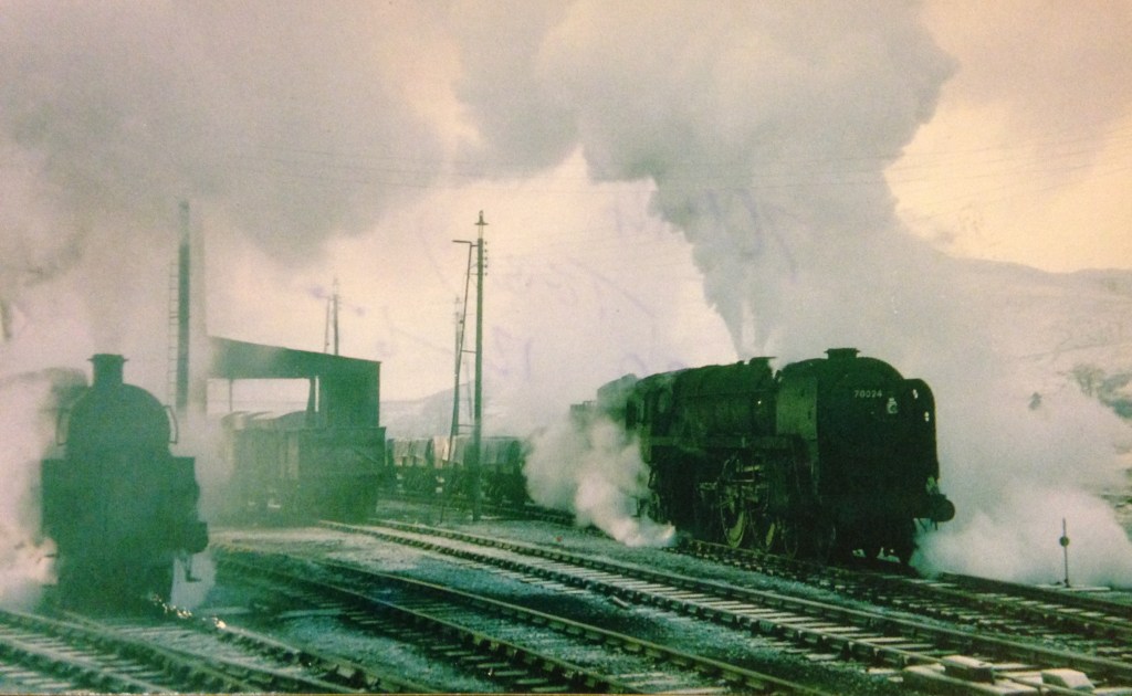 A very steamy spell at Tebay on a cold December 20th 1967, as 70024 ‘Vulcan’ starts a freight train out of the sidings and a standard class 4 is moving in the same direction, possibly to bank the train up to the summit.