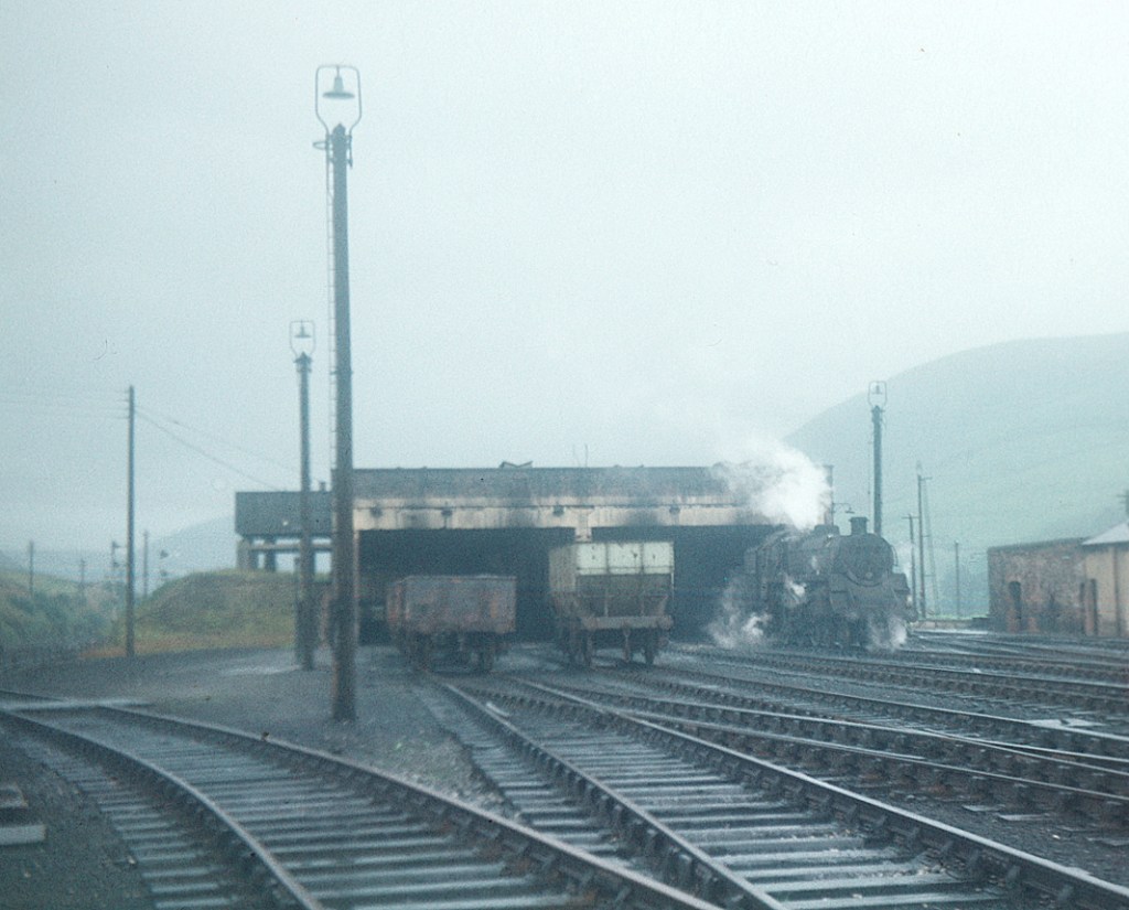An instamatic shot of Tebay shed on a drizzly day in the mid-1960s. A Standard class 4 4-6-0 stands easy for work, but I can’t read the number.