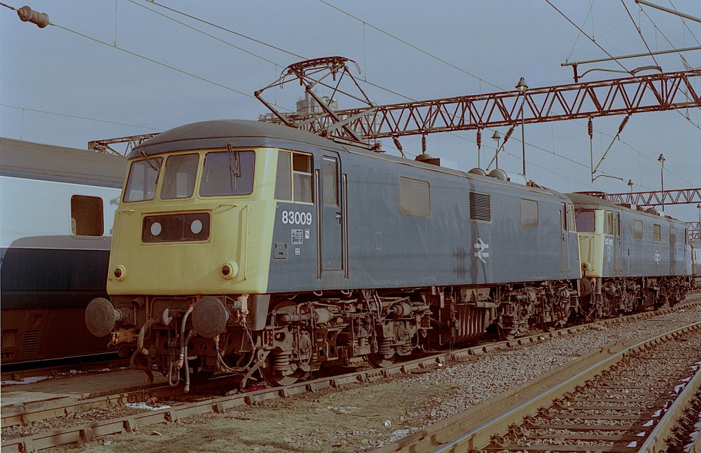 83009 and 83015 are seen in Wembley Carriage Sidings in 1980. I had not realised how complex the class 83 bogies were.