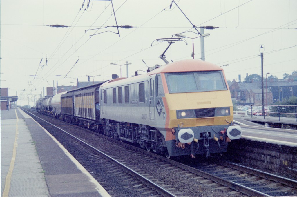 90130 is in charge of a mixed freight passing Wigan on a misty day in 1993. This locomotive was repainted in SNCF livery for the ‘Freightconnection’ show a few months earlier.