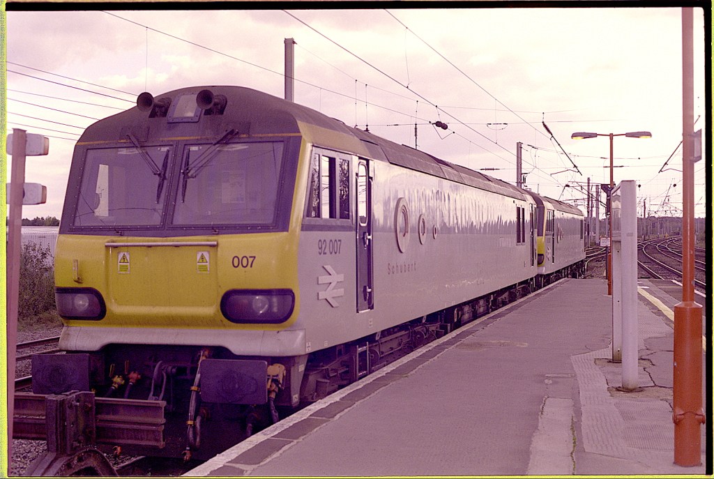 Another dodgy film colour balance. I have taken red out, but any more makes the yellow front turn green. Anyhow, the stabling siding at Bank Quay contains 92007 ‘Schubert’ and another member of the class in this 1994 view.