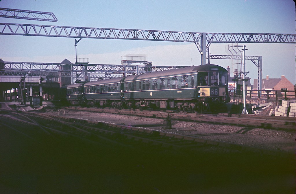 On the same day as the photo of 70023, a Birmingham RC&W three car DMU leaves Nuneaton on a local service. The leading vehicle is M50453, and a limited amount of research leads me to believe that the other two are M59161 and M50505. This unit was allocated to 5D Stoke On Trent at that time.