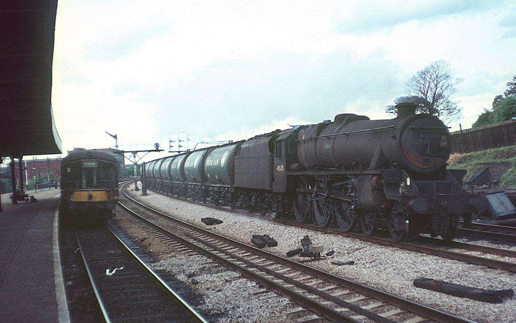 In 1967, Black 5 45135 is in charge of a soda ash train, passing a Derby lightweight DMU, with a destination reading ‘Barrow’, in the platform.