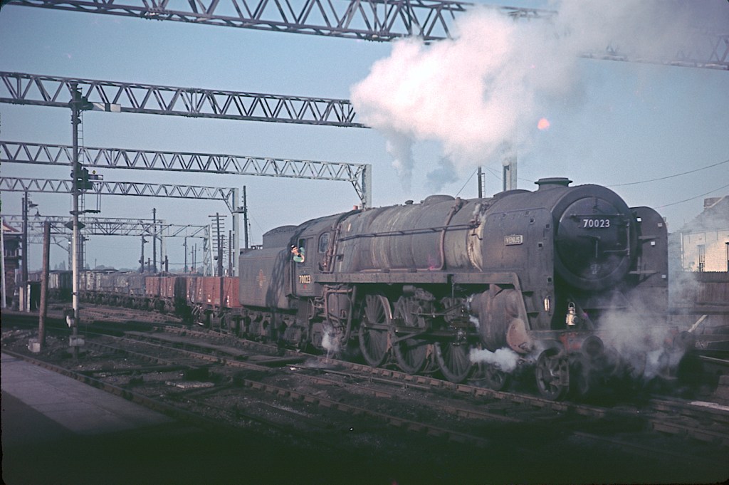 Electrification is coming, but not just yet at Nuneaton on October 18th 1962. Britannia 70023 ‘Venus’ is starting a mixed freight out of the sidings. The locomotive is in lined green livery, although very little cleaning was done to steam engines in those days. A challenge for those who weather models?