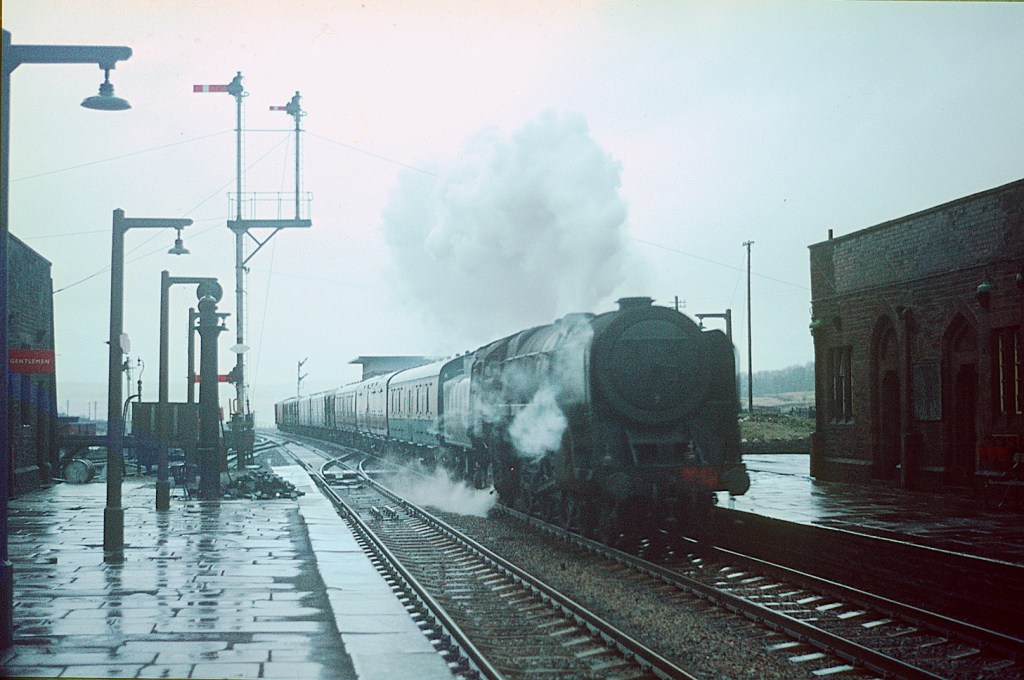 On a very wet day in winter 1967 a Britannia rushes through Tebay station with a parcels/newspaper train. Sadly, I cannot quite make out the smokebox number.