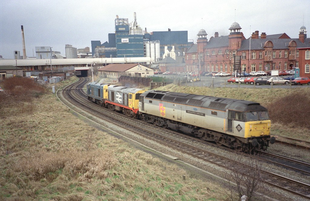 47060 ‘Halewood Silver Jubilee 1988’ tows 20059 and another class 20 having passed under the WCML and heading towards Arpley sidings, Warrington in 1994.