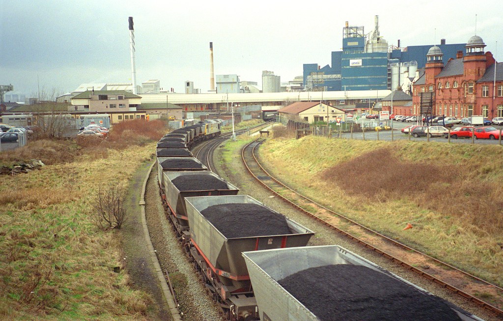 Also in 1994, 60032 heads for the bridge under the WCML with an MGR train of coal for Fiddlers Ferry power station on the line towards Widnes and Speke Junction. The power station cooling towers can just be seen on the distant horizon to the extreme left of this photo. The lines behind the photographer used to continue to Manchester, but are now truncated a mile or so to the east of Arpley sidings, and the rest of the route has become a long distance footpath.